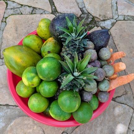 Baljen indeholder: Avocadoer, Ananas, Appelsiner, Papaya, Gulerødder, Matooke (spise-bananer), Passionsfrugter, Mangoer og en stor balje som familien bagefter kan bruge til vask el tøjvask.